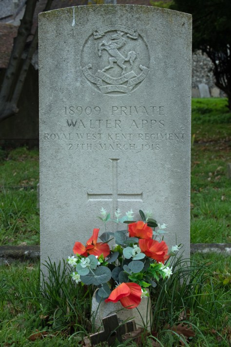 Walter Apps lies at rest in the graveyard of St Bartholomew’s Church in Bobbing, Kent.