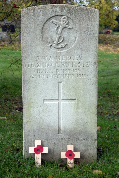 Stoker Mercer’s service was short, however; he had contracted bronchial pneumonia within weeks of the war ending and was admitted to the Royal Navy Hospital in Chatham. He passed away there on 28th November 1918. He was 28 years old.