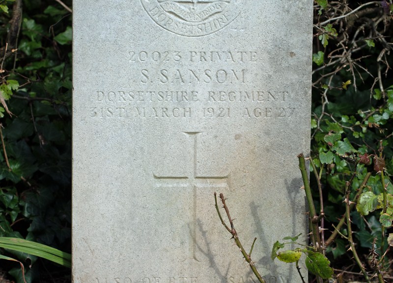 In a corner of Sherborne Cemetery stands a gravestone. It is dedicated to 20023 Private S Sansom of the Dorsetshire Regiment. He died on 31st March 1921, aged 27 years.