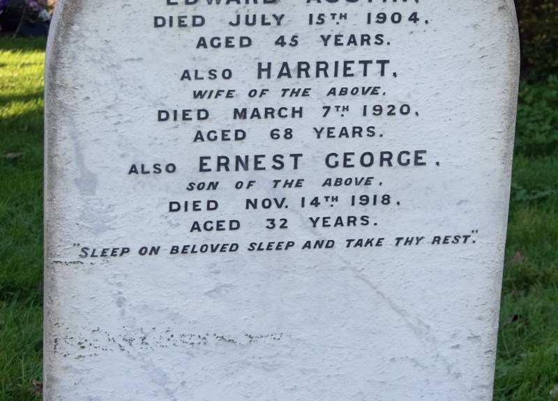 Private Ernest Austin passed away on 14th November 1918. He was 31 years old. He lies at rest in the graveyard of St Helen’s Church in his home village of Cliffe, Kent.