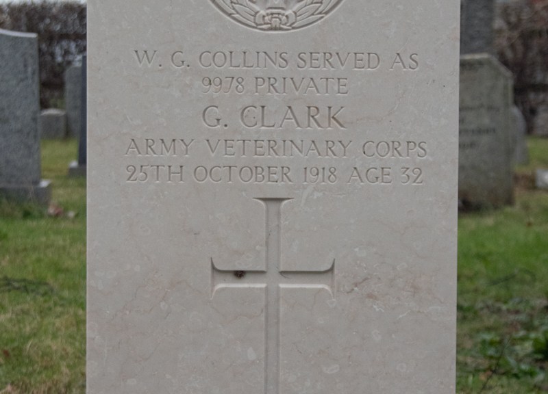 The headstone in question simply says “WG Collins served as Private G Clark in the Army Veterinary Corps”, but the research tools I normally use drew blanks.