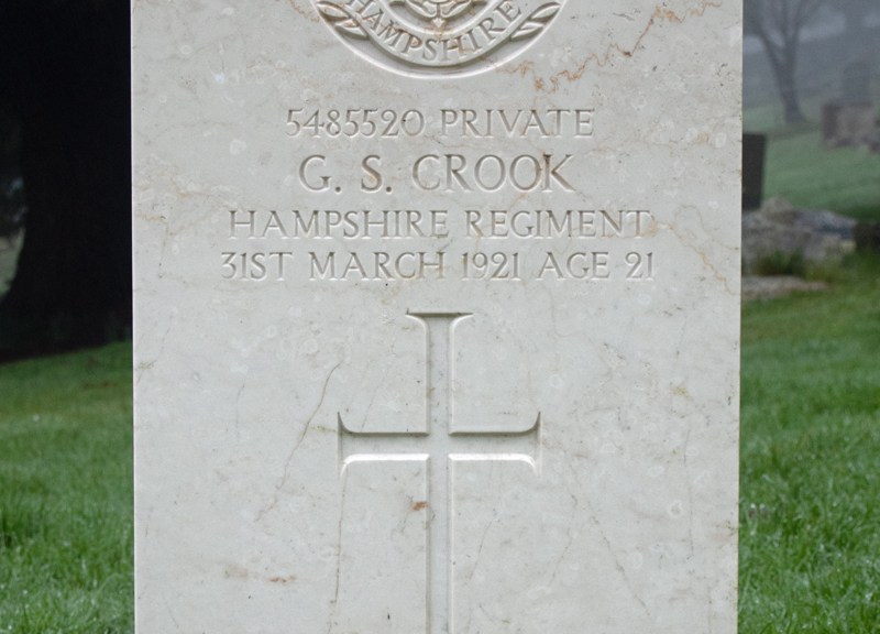 He enlisted in the Hampshire Regiment, whose battalions served both in France and on the home front. There is conflicting information about his service, but Private Crook appears to have fought at the front, gaining the Victory and British Medals.