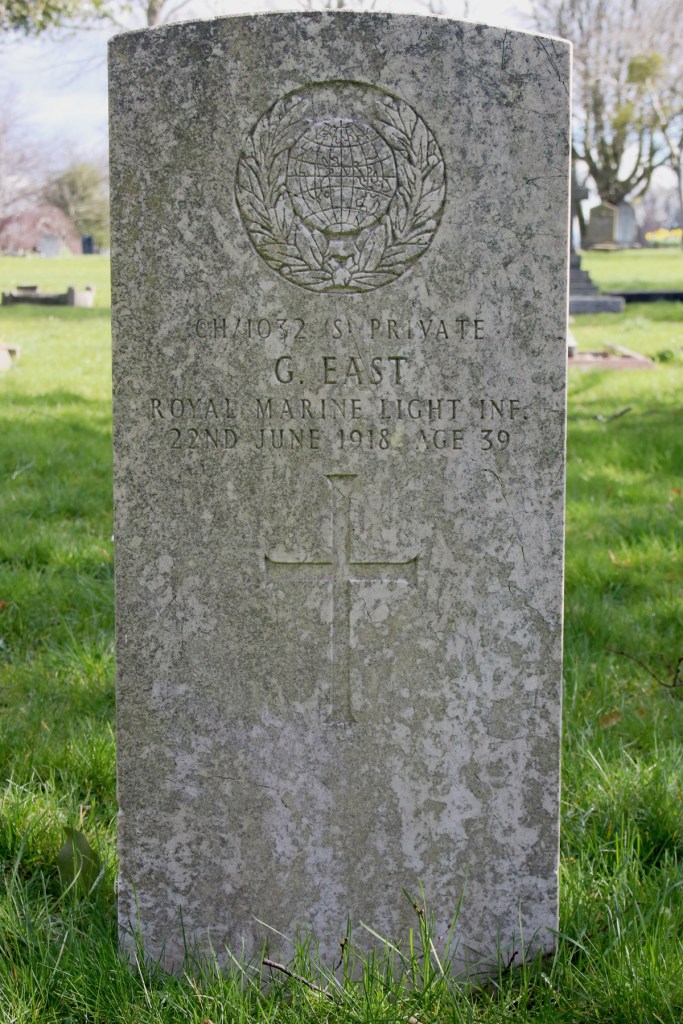 George enlisted in the Royal Marine Light Infantry on 29th September 1915, and served at the Naval Dockyard in Chatham, Kent. Private East was based there for most of the war, but fell ill, succumbing to stomach cancer on 22nd June 1918. He was 39 years old.