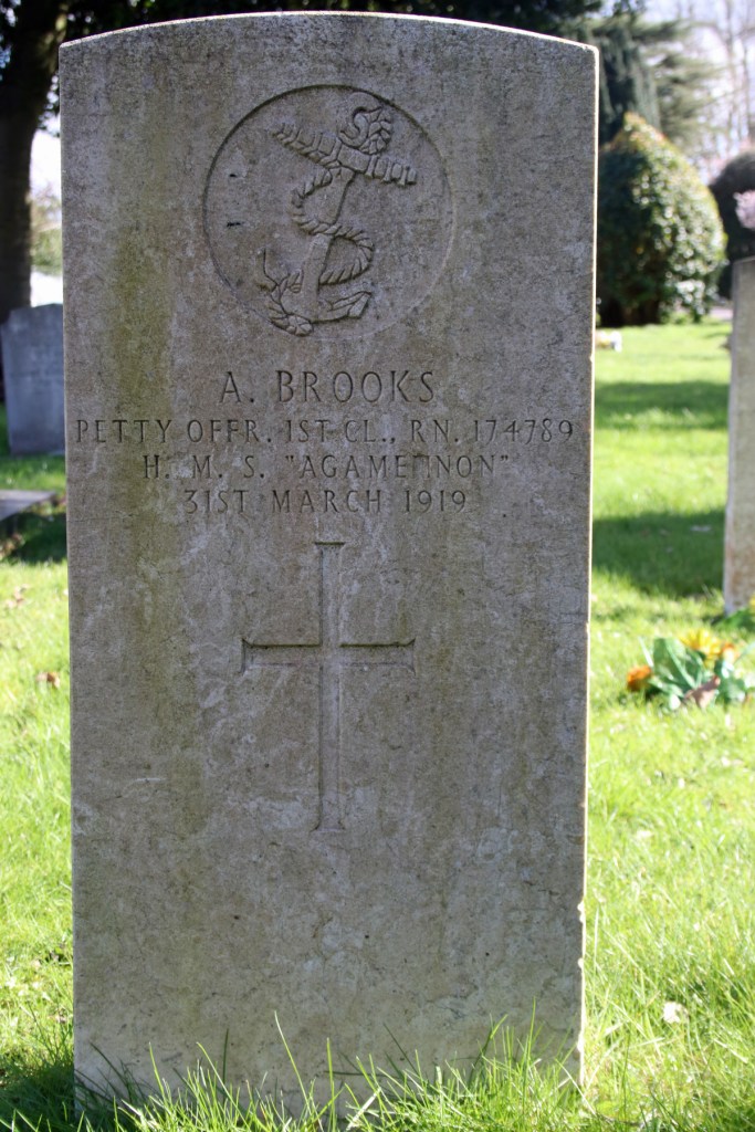 Petty Officer Brooks served aboard Agamemnon for eighteen months, but it was while stationed at the Naval Dockyard in Chatham that he fell ill. He passed away from aortic disease of the heart – more than likely a heart attack or cardiac arrest – on 31st March 1919. He had just turned 42 years of age.