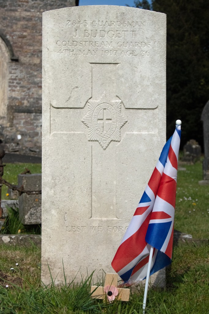 The next record for James Budgett is confirmation of his passing. He died from an aneurysm on 4th May 1917, at the age of 36. He lies at rest in the graveyard of St Michael’s church in his home village of Stoke St Michael, Somerset.