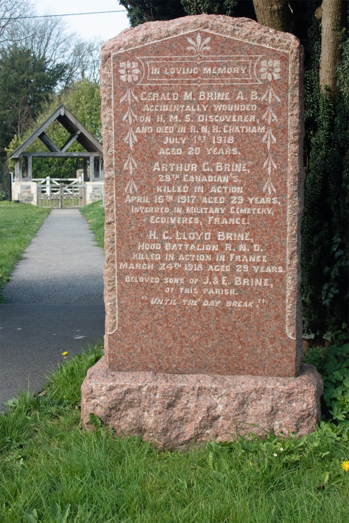 Able Seaman Brine was first reported missing on 24th March, but was only accepted as having been killed in action on that date nine months later. As such, Herbert is commemorated by name on the Arras Memorial; his name also resides on Gerald’s gravestone back home in Binegar.