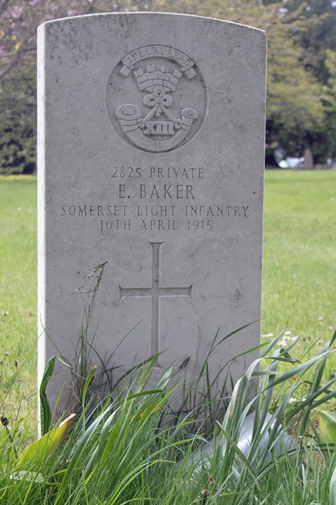 Ernest’s military service records are lost to time; he enlisted in the Somerset Light Infantry, joining the 5th Battalion at some point early in the war (certainly before October 1914). Private Baker’s battalion seems to have been part of a territorial/reserve force, and he was based in his home town of Taunton.