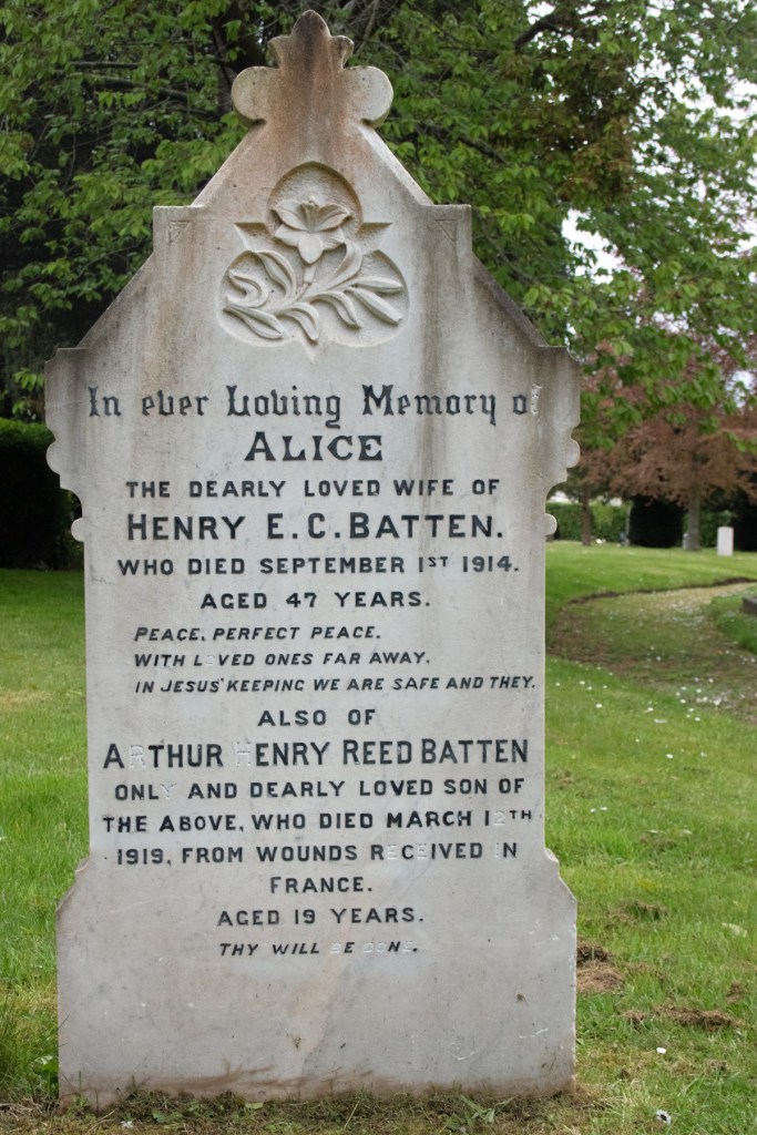 Arthur Henry Reed Batten was brought back to Taunton burial, and lies in the family grave in St James’ Cemetery, alongside his mother.