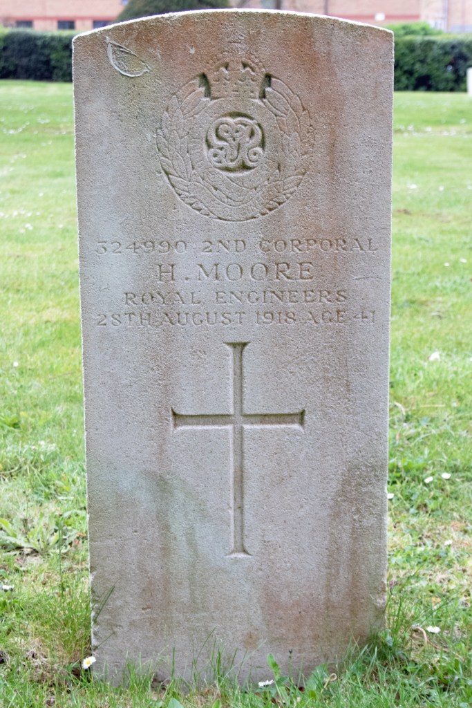 The next evidence we have of Corporal Moore is in the Army Register of Soldiers’ Effects. This confirms that he had been admitted to the Southern General Hospital in Bristol with an illness, and that he subsequently passed away on 28th August 1918, at the age of 41.