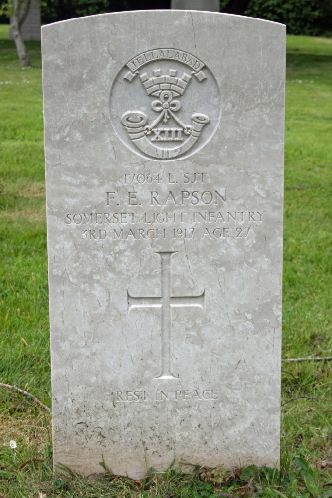 Frederick Ernest Rapson was buried in a quiet corner of St James’ Cemetery in Taunton, Somerset.