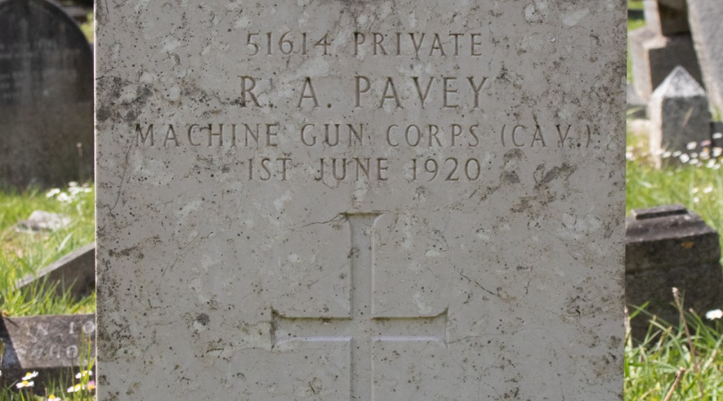 Roland enlisted in the army in January 1915. Initially joining the North Somerset Yeomanry, he soon transferred across to the Cavalry Division of the Machine Gun Corps. Sadly, Private Pavey’s military records are lost to time, but he definitely saw action on the Western Front, gaining the Victory and British Medals and the 1915 Star for his efforts.