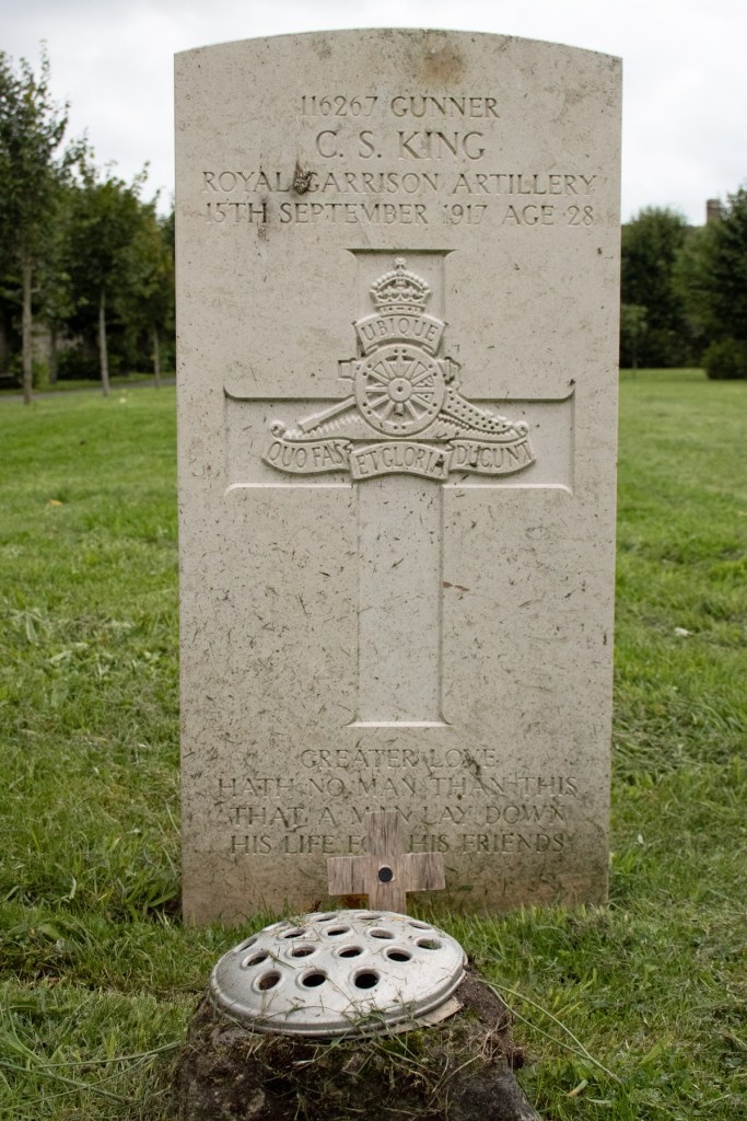 Exact details of Gunner King’s service are not available. He was certainly involved in fighting during the summer of that year, and, in September, was wounded. Evacuated back to England with a gunshot wound to his left ankle and shell shock, he was admitted to the War Hospital in Sunderland. Sadly, septicaemia set in, and he passed away on 15th September 1917, at the age of just 28 years old.