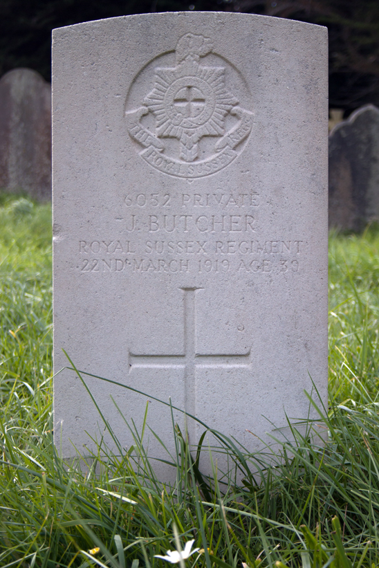 When war arrived on England’s shores, James was keen to to his bit. He initially joined the Royal Sussex Regiment, although subsequently moved to the Agricultural Company of the Labour Corps. Sadly, Private Butcher’s military service records are no longer available, so it’s impossible to confirm exact dates for his time in the army.