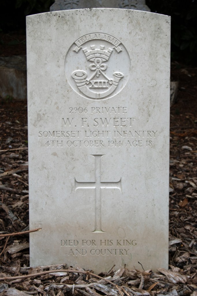 William Frank Sweet died on 4th October 1914, at the age of just 17 years old. His body was brought back to Yeovil, and he was buried in the town’s cemetery on 10th October, the day after his Battalion set sail across the English Channel to join the onslaught.