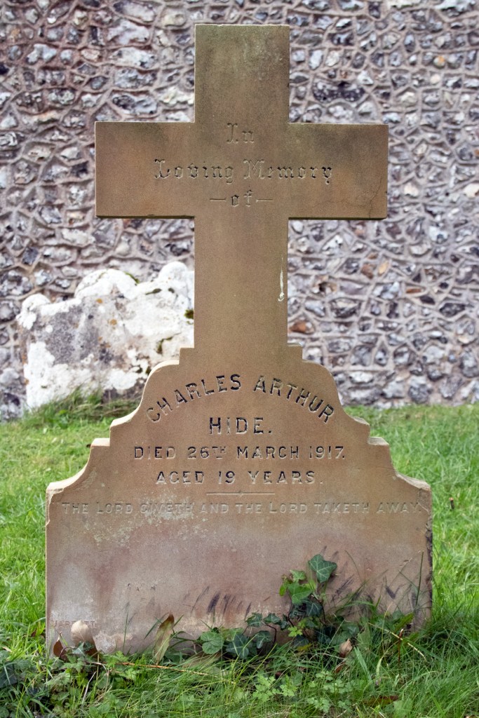 Charles Arthur Hide’s body was brought back to Sussex for burial. He lies at rest in the quiet graveyard of St Mary the Virgin Church in his home village of Clapham.