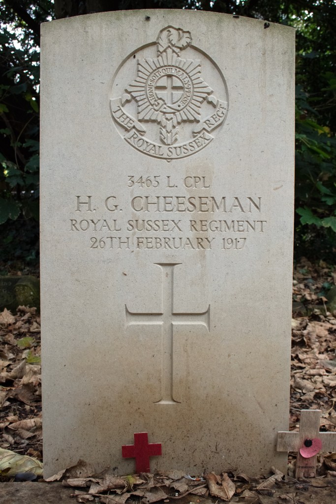 Lance Corporal Cheeseman’s injuries proved to be life-changing. A later newspaper report stated that he had been “physically helpless” [Worthing Gazette: Wednesday 5th March 1917], so paralysis seems likely. Awarded the British and Victory Medals and the 1914 Star, he was medically discharged from the army in May 1916.
