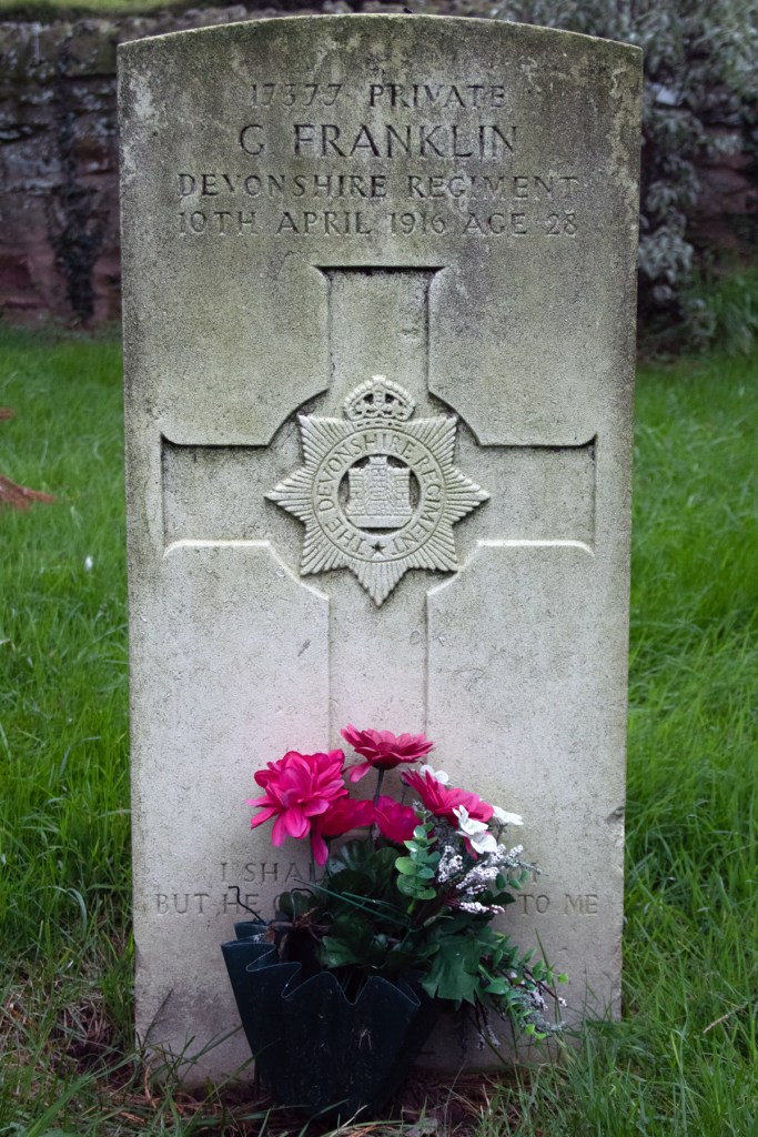 Private George Franklin died on 10th April 1916, having been suffering from cerebro-spinal fever – meningitis. He was just 28 years of age. He was laid to rest in the graveyard of his village church, St Peter’s in North Newton.