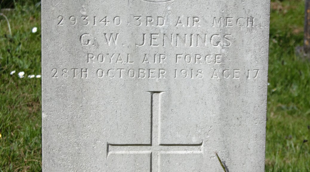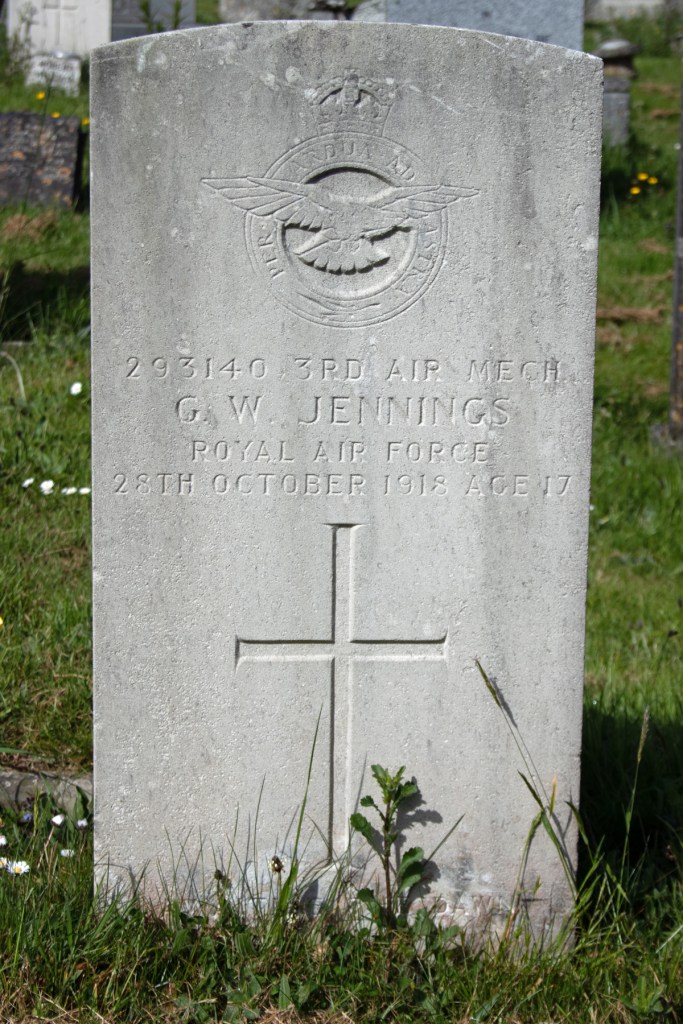 Air Mechanic Jennings was sent to Buckinghamshire for training, but his time there was to be tragically short. Within a matter of weeks he was admitted to the Central Military Hospital in Aylesbury with pneumonia. The condition was to prove too much for his body: he passed away on 28th October 1918. He had been in the Royal Air Force for just 52 days and was a victim of his desire to get involved in the war before it was too late to do so. He was 17 years of age.