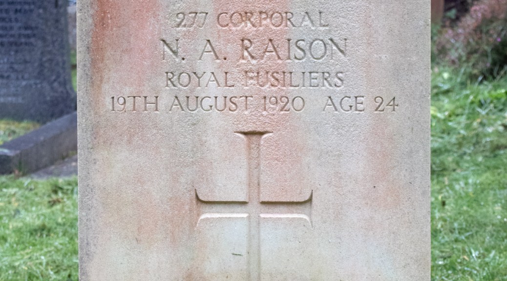 The funeral took place at the Cemetery on August 24 of Corporal Austin Neal Raison… who died on the previous Thursday from wounds received in action. Deceased was 24 years of age and in September 1914, he volunteered for service in the Army, joining the Royal Fusiliers. He went to France in October 1915, and took part in most of the important battle from that date until he was severely wounded in the retreat from Cambrai. He returned home, and everything possible was done for him, but he never recovered health, and gradually sank, dying at his father’s house to the sorrow of all who knew him.