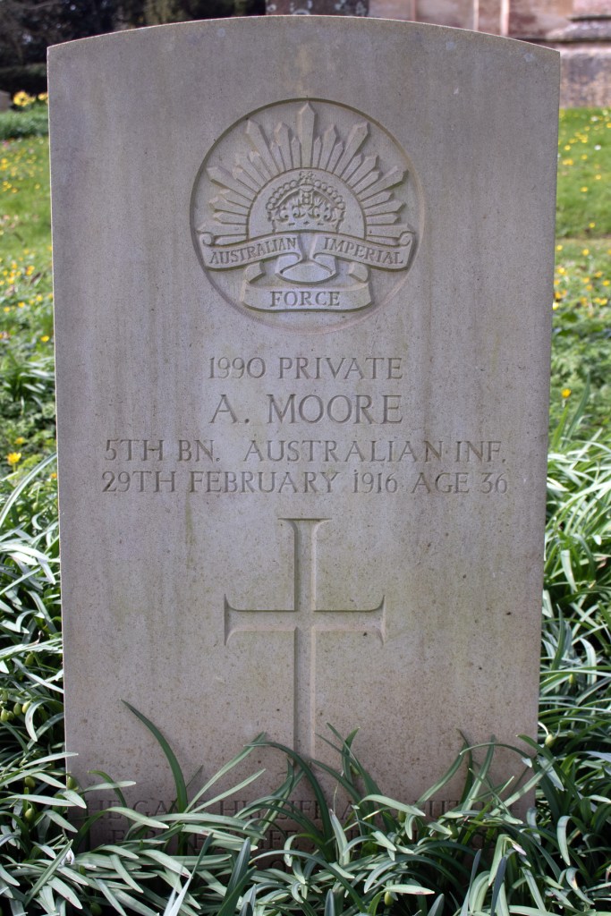 On Wednesday 1st March, the relatives of Private Arthur Moore, formerly of Whatley, heard with great regret the sad news that he had passed away. Private Moore, who belonged to the 5th Battalion Australian Expeditionary Force, left Whatley about fourteen years ago for Australia, where he lived until last year. When war broke out he was among the first in Australia to respond to the call of the Motherland. After undergoing his training he was sent to the Dardanelles, and there with many other brave Anzac received what was to prove his death wound, being shot in the head last August by a Turkish sniper. He was brought to King George’s Hospital, London, where he remained for some time and was thence sent to a convalescent home at Isleworth. But three weeks ago his friends, who were expecting him home, were alarmed to hear that he had been sent to the hospital to be again operated on, the wound not having satisfactorily healed. The operation took place on February 28th, but was not successful, as he never rallied, and died the next day… So has passed away another who had tried to do his duty, another of Britain’s many sons who are dying that England may liv. May he rest in peace!