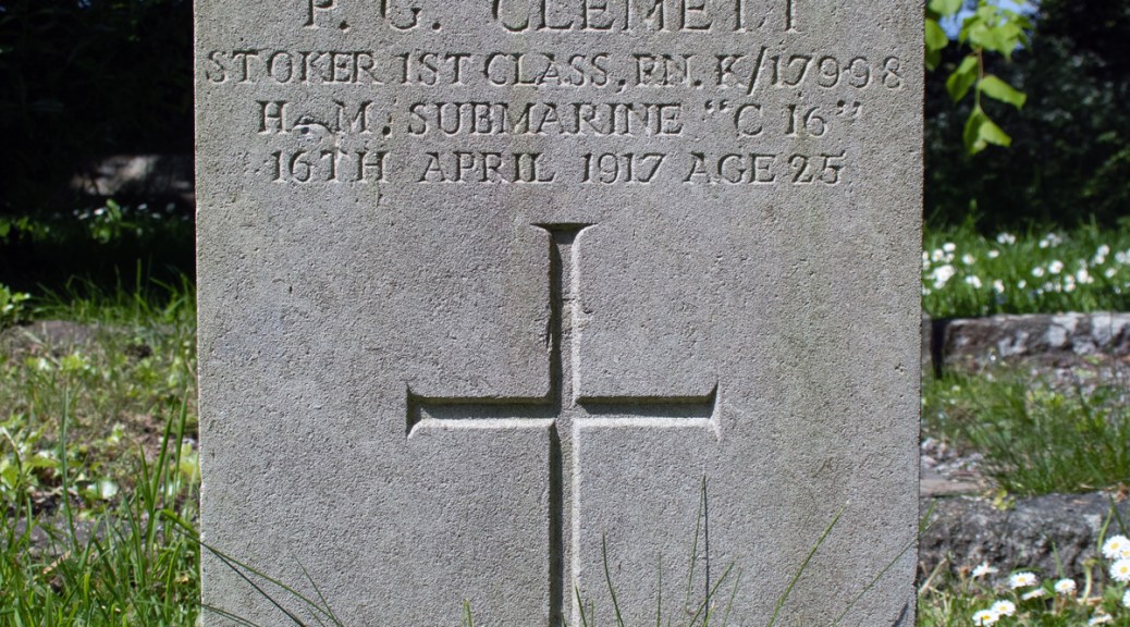 When the submarine was salvaged, Phillip George Clemett’s body was brought back to Somerset for burial. He was laid to rest in the peaceful graveyard of St Peter’s Church in Huntspill.