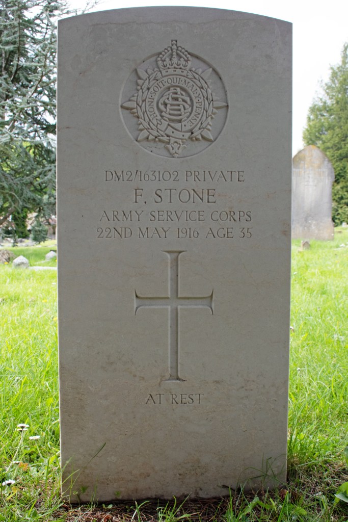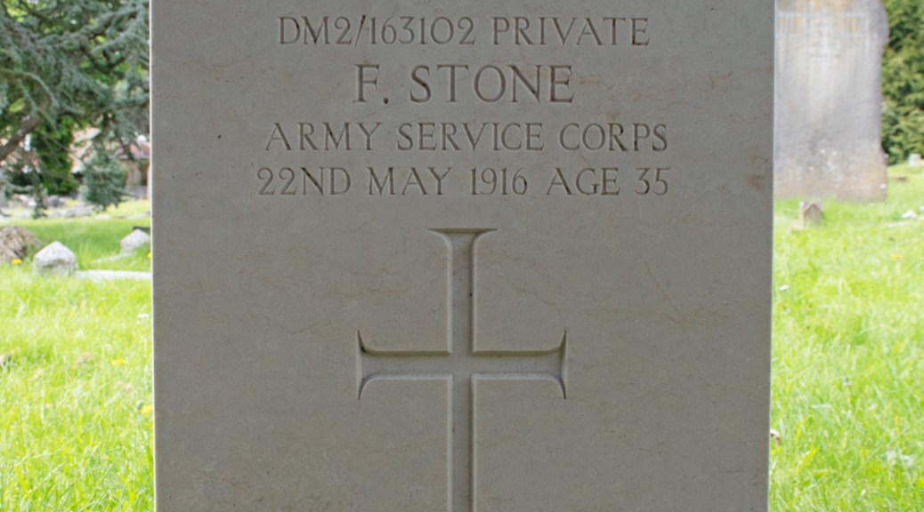 A lot of the life of Frederick Stone is destined to remain shrouded in mystery. His grave lies in the St Michael’s Cemetery, Bath, Somerset. The headstone confirms that he was a Private in the (Royal) Army Service Corps when he passed away on 22nd May 1916, at the age of 35.
