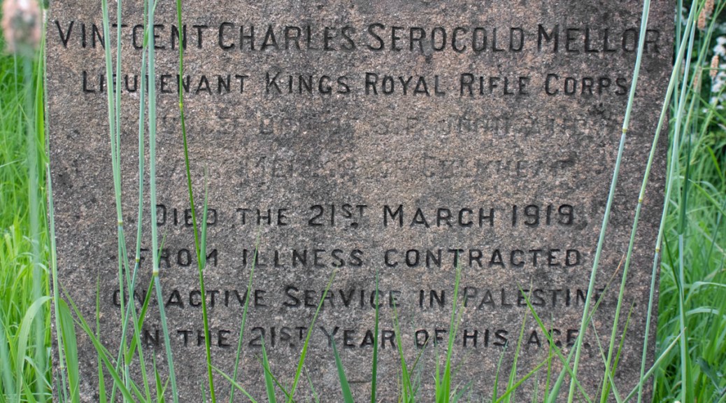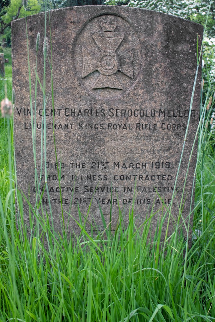 At some point, Vincent was given a commission in the King’s Royal Rifle Corps, but his service records are lost to time, which makes it impossible to find any specific information about his military career. Lieutenant Mellor’s headstone confirms that he served in Palestine, and that he fell ill while in the Middle East.