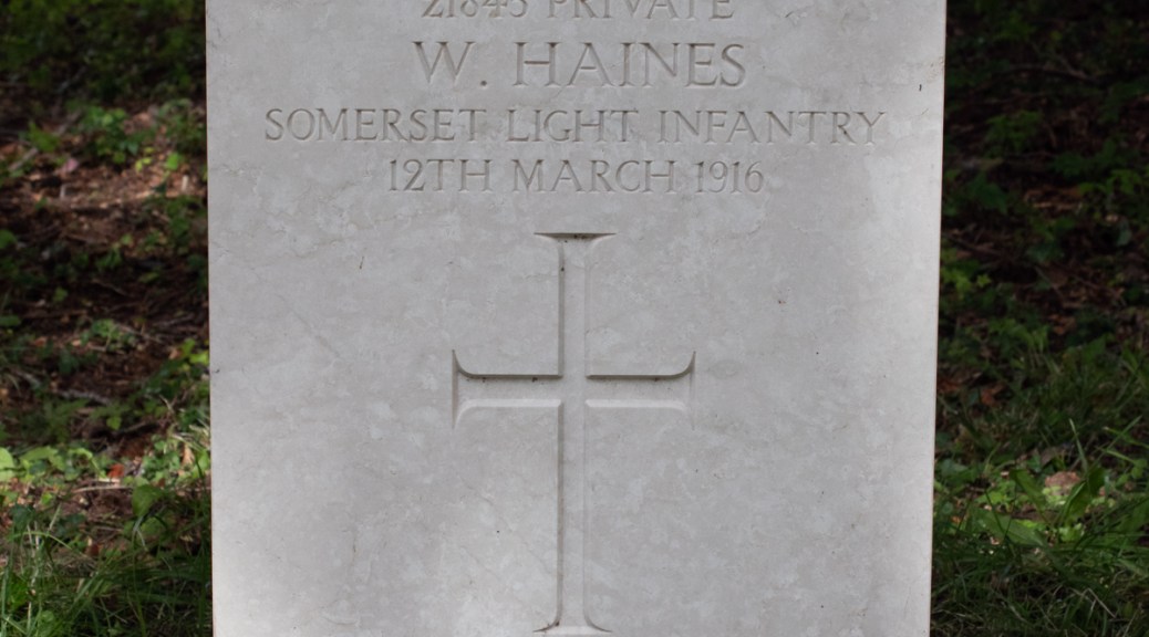 Tauntonians will learn with deep regret of the death of Private W Haines, of the No. 5 Supernumerary Company, 4th Battalion Somerset Light Infantry, which took place at the Portishead Red Cross Hospital, at the age of 64. The funeral took place at the Portishead Cemetery on Friday of last week, the deceased being buried with full military honours… The late Private Haines… came up with the last Company of the National Reserves, about 14 months ago… and during that time did his duty to the satisfaction of the office commanding and all other officers concerned. Corporal Jarman, who is a well-known Tauntonian of the same Company writes: “Private Haines was a fine old soldier, doing his duty in a manner with would be a credit to any youngster, and his death came as a surprise to all of us. There are still with us half-a-dozen of the old ‘sixties’, and I hope when some of these conscientious objectors see this they will alter their mind, and do their little bit for their King and country like he did.”