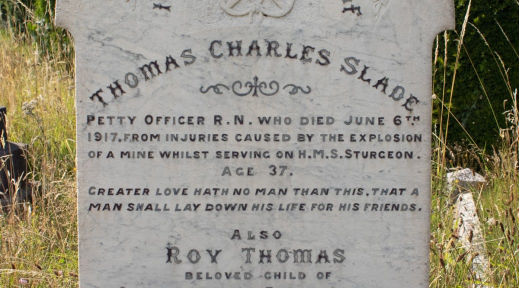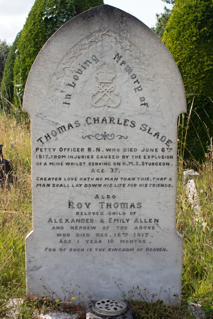 In June 1917, a mine exploded on board, injuring a number of the crew, including Petty Officer Slade. The wounded were transferred to a hospital near Ipswich, and it was here that Thomas was to pass away. The only one of those caught up in the incident to die, he was 37 years of age.