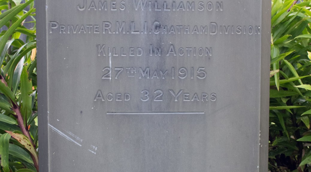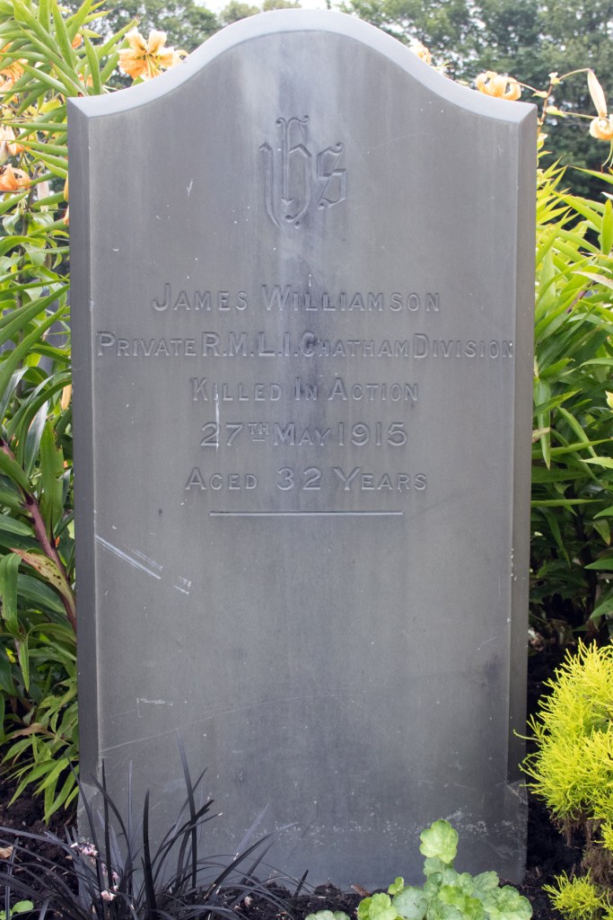 In amongst the rows of naval headstones in the Woodlands Cemetery in Gillingham, Kent, is one dedicated to James Williamson, a Private in the Royal Marine Light Infantry. He was killed in action on 27th May 1915, while attached to the ship HMS Princess Irene, and was 32 years of age when he passed.