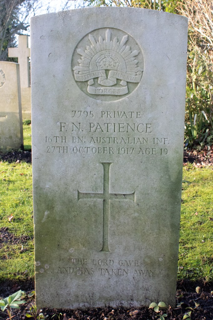 Frank Nicholas Patience was 9,000 miles (14,500km) from home. He was laid to rest in the extended graveyard of St Mary’s Church in Codford, Wiltshire.