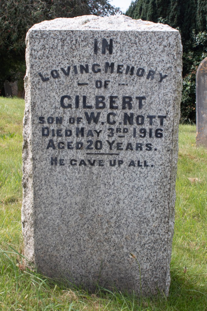 At the family’s request, the body of Gilbert Charles Nott was taken back to Devon for burial. He was laid to rest in the graveyard of St Michael’s Church in Bampton, the church in which he had been baptised just two decades before.
