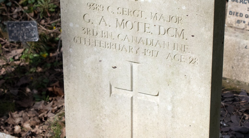 Attached to the 3rd Battalion of the Canadian Infantry, Sergeant Mote arrived in St Nazaire, France, on 11th February 1915. His unit was thrown into the deep end from the start, and George’s actions at the Second Battle of Ypres that spring won him the DCM. By the autumn, he had been promoted to Company Sergeant Major.