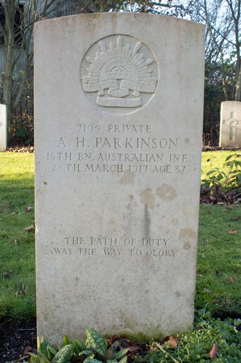Illness amongst the Australian troops was rife by the time they arrived in Britain, and Private Parkinson was not to be immune. He was admitted to the Military Hospital connected to the camp on 20th March, suffering from bronchial pneumonia. The condition worsened, and he died just six days later. Alfred was 36 years of age.