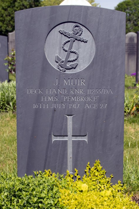 Deck Hand Muir initially served on the depot ship HMS Zaria, before bring transferred to the cruiser HMS Brilliant. By the spring of 1917, he was stationed at HMS Pembroke, the Royal Naval Dockyard in Chatham, Kent.