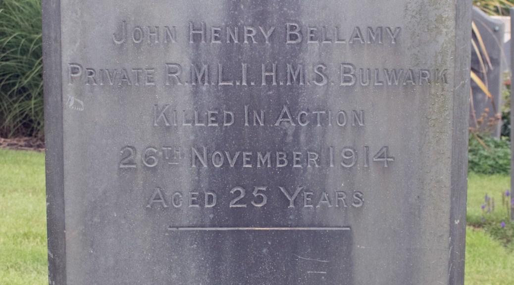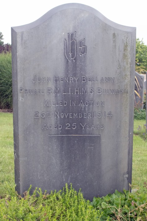 In July 1914, John was assigned to HMS Bulwark, and would remain with her for the next few months. Indeed, he was on board Bulwark on the 26th November 1914, when she was moored close to Sheerness, Kent. That morning, an explosion ripped through the ship, sinking it and killing more than 740 people. Private Bellamy was amongst them: he was just 24 years of age.