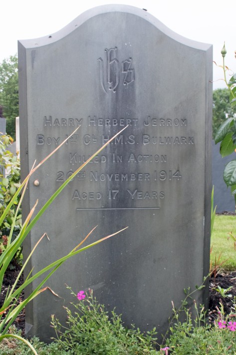 Harry was assigned to the battleship HMS Bulwark. Part of the Channel Fleet, she was tasked with patrolling and defending Britain’s southern coast. On 26th November 1914, Bulwark was moored in the River Medway, close to Sheerness, and was being stocked with shells and ammunition. That morning, some poorly stowed cordite charges overheated, detonating the shells stored nearby. The resulting explosion ripped through the battleship, and more than 740 crew were killed. Boy 1st Class Jerrom’s was among the bodies to be recovered: he was 17 years of age.