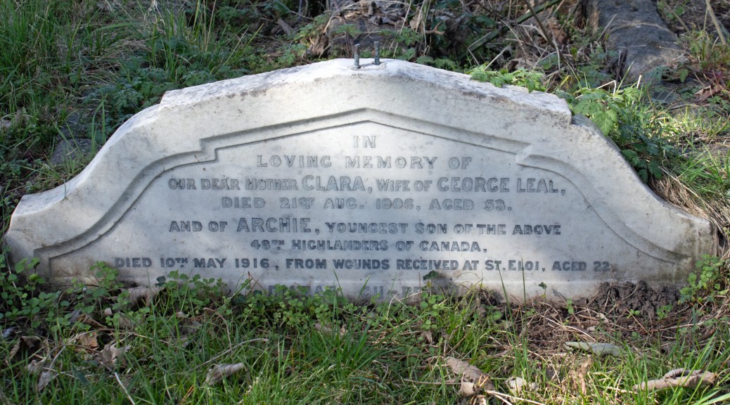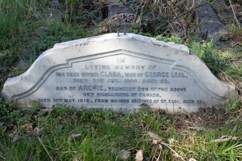 The body of Archibald Edmund Leal was taken back to Worthing for burial. He was laid to rest with full military honours in the town’s Broadwater Cemetery. A local newspaper reported that “Private Leal, although not a Canadian, was possessed of true Colonial grit, and had had his full share of active service.” [Sussex Daily News: Wednesday 17th May 1916]