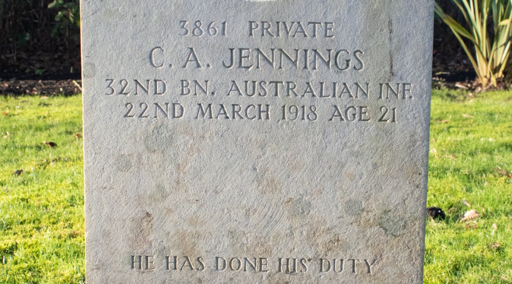 When he finished his schooling, Clarence found work as a labourer. War broke out on the other side of the world in the summer of 1914, and he was called upon to play his part. He enlisted in the Australian Imperial Force on 30th June 1917, and, Robert having passed away nine years earlier, he seems to have reverted to his mother’s name, Jennings.