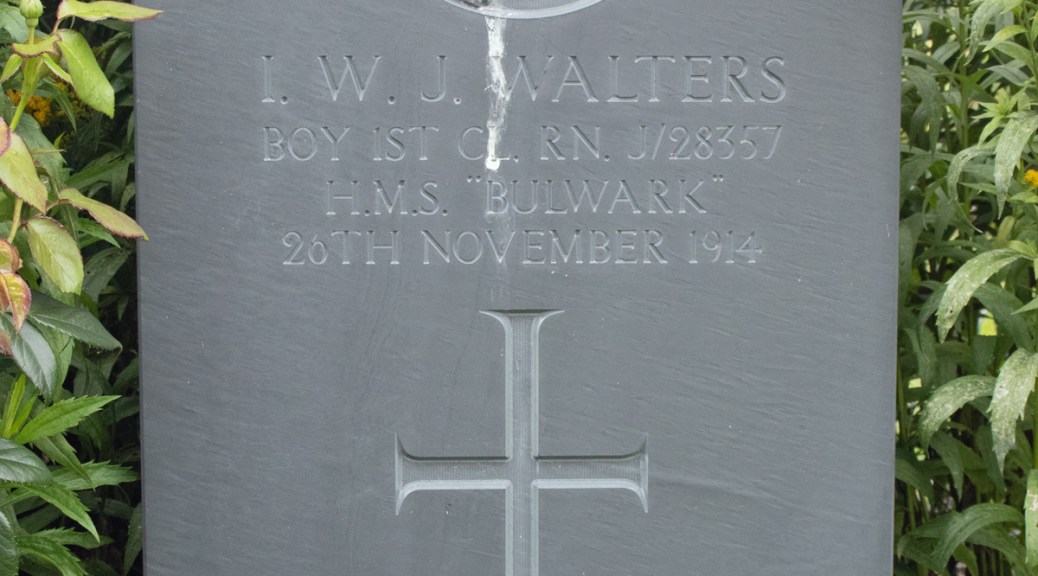 Part of the Channel Fleet, Bulwark was tasked with patrolling and defending Britain’s southern coast. On 26th November 1914, Bulwark was moored in the River Medway, close to Sheerness, and was being stocked with shells and ammunition. That morning, some poorly stowed cordite charges overheated, detonating the shells stored nearby. The resulting explosion ripped through the battleship, and more than 740 crew were killed. The body of Boy 1st Class Walters was among those to be recovered: he was 16 years of age.