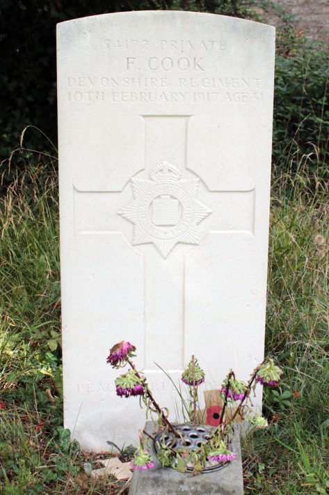 By the time war broke out, Frederick as 48 years old. He still stepped up to play his part, however, and, while his service papers have been lost to time, it is clear that he had joined the Devonshire Regiment by the summer of 1916. Attached to the 13th (Works) Battalion, Private Cook remained on home soil during his time with the army.
