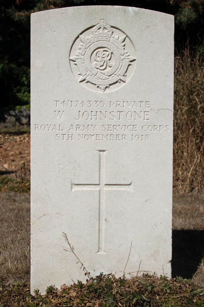 In the First World War section of St Peter and St Paul’s Churchyard in Aylesford, Kent, is a headstone dedicated to T4/174339 Private W Johnstone of the Royal Army Service Corps. Little other immediate information is apparent, and there are no military records available based on his service number.