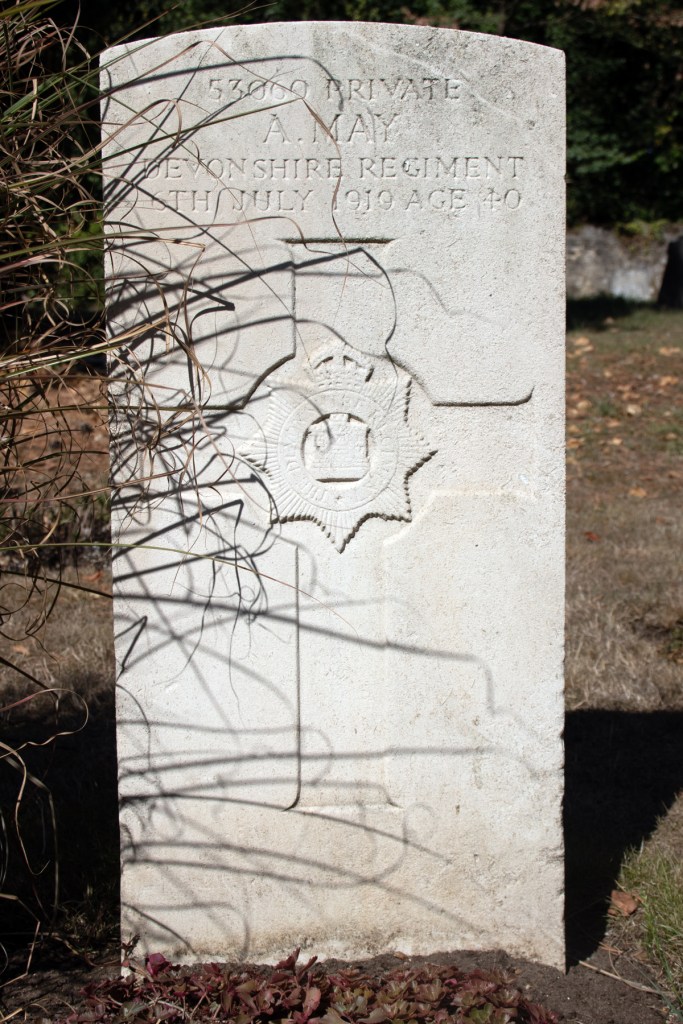 Details of Private May’s war service is pretty limited, but he seems to have enlisted in the Devonshire Regiment in February 1917. He subsequently transferred to the 167th Coy Labour Corps and was sent to France, but returned to Britain a month later, having fallen ill. His condition turned out to be tuberculosis and he was medically discharged from the army in August 1917.