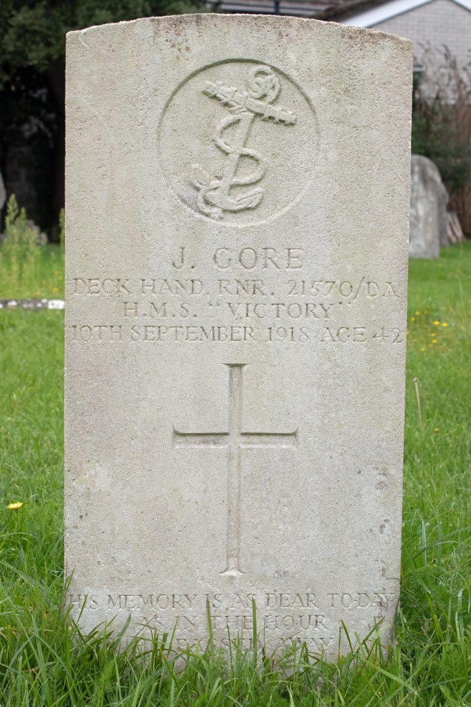 Deck Hand Gore was sent to HMS Victory, the Dockyard in Portsmouth, Hampshire, for his initial training. Here, billeted in cramped barracks, perfect breeding grounds for germs and disease, he quickly became ill. Having contracted pneumonia, James was admitted to the Haslar Hospital in Gosport. The condition was to take his life: he passed away on 10th September 1916, less than three weeks after enlisting. He was 40 years of age.