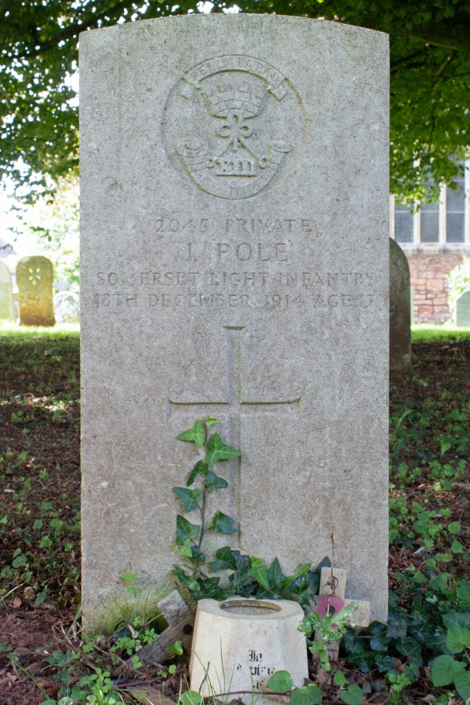 John Pole’s body was brought back to Fitzhead for burial. He was laid to rest in the tranquil surroundings of St James’ Churchyard, close to where his father and siblings still lived.