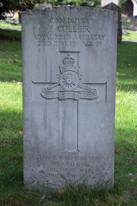 Driver Frederick William Collier succumbed to his injuries on 23rd June 1915. He was 23 years of age. His body was taken back to Wiltshire for burial, and he was laid to rest in Westbury Cemetery, not far from where his grieving parents still lived.