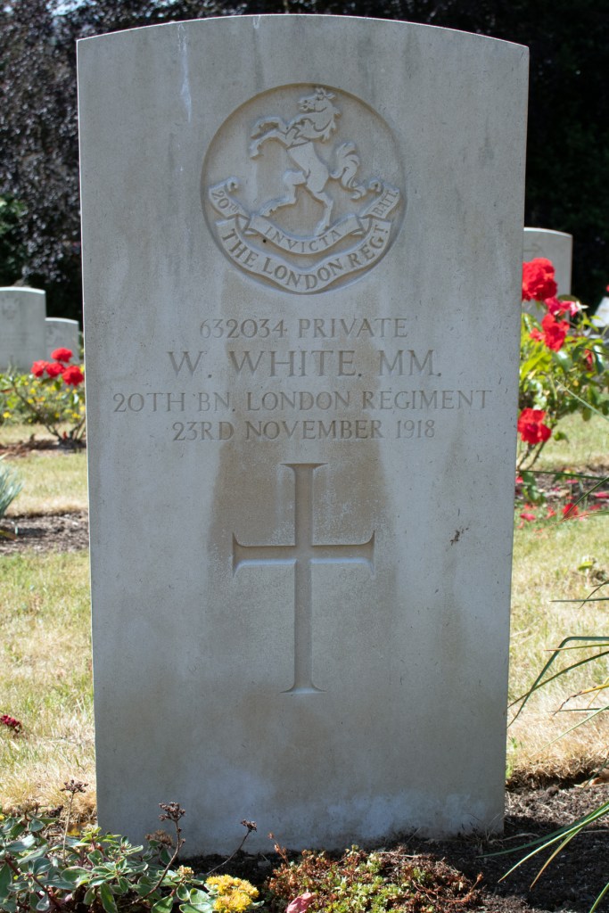 When war was declared, William stepped up to play his part. Full service details have been lost to time, but it seems that he had enlisted by the spring of 1918 at the latest. He joined the London Regiment, and was assigned to the 20th (City of London) Battalion. Private White’s unit spent the duration of the conflict on the Western Front, fighting at Loos, the Somme and Messines amongst other areas.