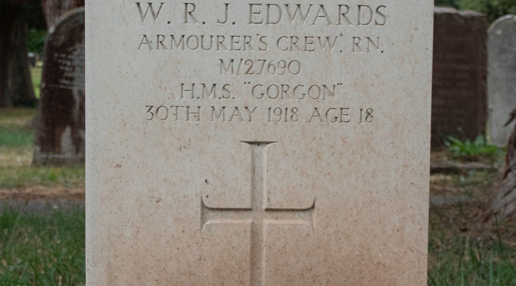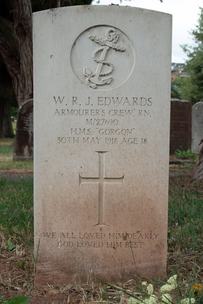 Tragically, this first assignment was to be Armourer’s Crew Edwards’ last. Within a matter of weeks, he was taken back to HMS Vivid, suffering from tubercular meningitis. Back at base, the condition proved too much for the young man: he passed away on 30th May 1918, days shy of his 19th birthday.