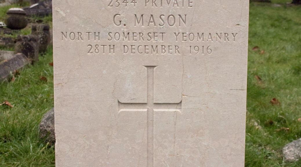 His military career began with the old 1st Volunteer Battalion of the [Somerset Light Infantry], which whom he served six years. After leaving the infantry he joined the North Somerset Yeomanry. At the outbreak of war he was mobilised with the Yeomanry, and from August 1914, to the November of the same year he was stationed with the regiment in different parts of this country. When the regiment was sent to France, he was sent, much against his will, to the Regimental Depot at the Drill Hall, Lower Bristol Road, and remained there as a member of the staff until his death. While there he was promoted to Corporal. His constant wish was to be with his regiment in France, but his state of health would not have allowed him to stand the rigours of a campaign.
