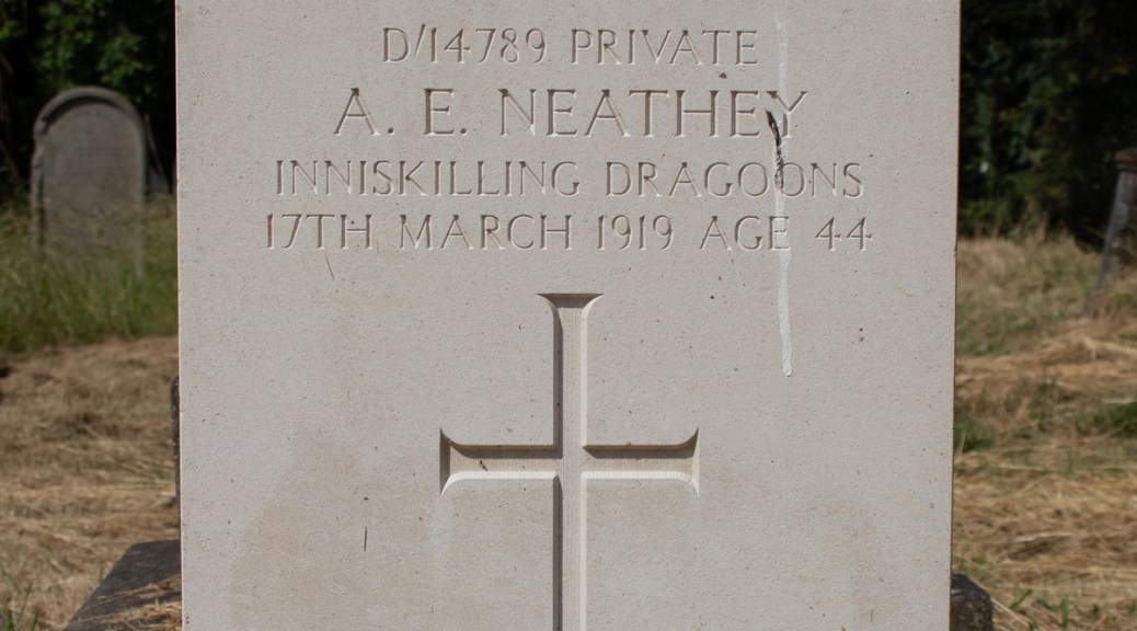 As part of his retention on home soil, Albert was transferred across to the 6th Dragoons (Inniskilling) Reserve Regiment. Nothing on the available documents, however, suggest a promotion during his time in Bath. Albert Ernest Neathey died on 17th March 1919: he was laid to rest in the city’s sweeping Lockbrook Cemetery.